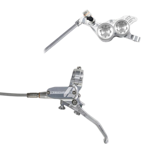 Con los nuevos Hope Tech 4 V4 se ha conseguido un aumento de potencia del 30% en comparación con el Tech 3. El Tech 4 utiliza un sellado interno completamente nuevo, además el pivote gira sobre rodamientos reduciendo la fricción, minimizando la fatiga en las manos y se manteniendo la modulación y la sensibilidad. La pinza del V4 está mecanizada en una sola pieza y utiliza pistones de acero inoxidable de estilo híbrido. Tienen un inserto fenólico que permite un movimiento más suave y además menos mantenimiento. Al mismo tiempo resiste la altas temperaturas sin transferencia de calor durante el uso extremo. El latiguillo metálico evita la dilatación del sistema hidráulico por el calentamiento manteniendo la potencia de frenado. Este tipo de frenos también son muy aconsejable en Ebikes, ya que el elevado peso de estas bicis exige una potencia extra.