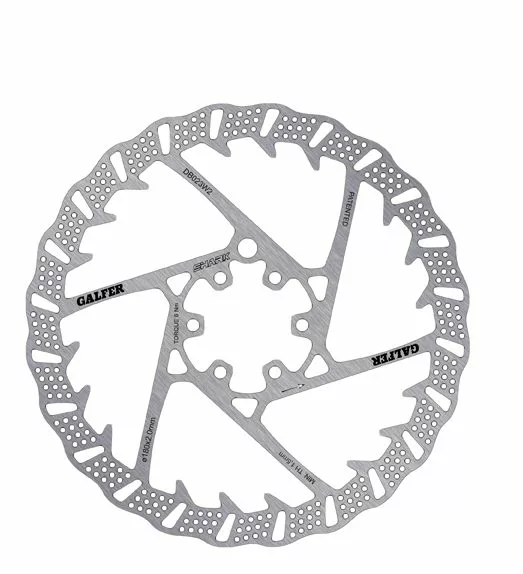 El nuevo disco de freno Galfer Disc Shark es el más completo del momento! Su proceso de fabricación por corte láser ha permitido conseguir un diseño que consigue las mejores prestaciones para las modalidades más agresivas y para las Ebikes. Sus aletas interiores y los agujeros internos en la pista rebajan la temperatura, mientras que el diseño exterior Wave y las ventanas transversales dotan a este disco de 2 mm de espesor de una mordida potente y homogénea.El disck Shark reduce de una forma drástica la temperatura en un 30% respecto a otros discos de gama alta y bajo condiciones habituales las pastillas duran hasta un 25-40% más. Este disco hace que se necesite una menor presión en el circuito de freno, lo que supone menor esfuerzo a la hora de frenar y a la vez se consigue una mayor potencia de frenada. Incluso en las condiciones más desfavorables mantiene un comportamiento estable y consistente en todo momento. Además es más ligero que la mayoría de los discos de esta gama gracias a su diseño optimizado.